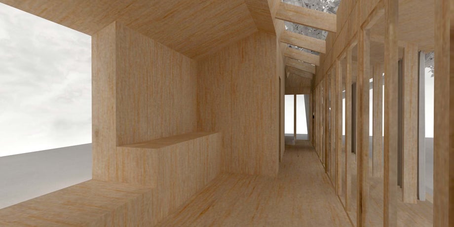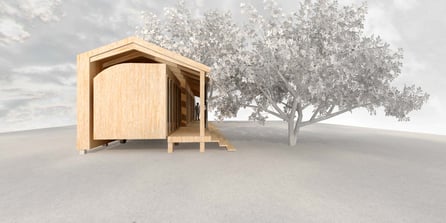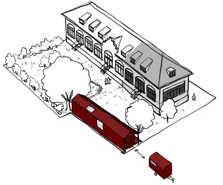 Der mobile Raumkörper kann in die fixe Gartenpavillonstruktur eingefahren und angedockt werden. Aus der Zweizimmerwohnung wird so eine Dreizimmerwohnung.