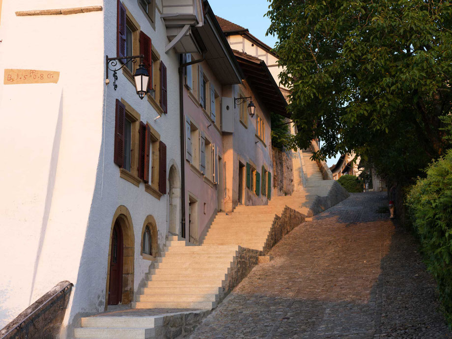 Mit ihren beidseitigen Häuserreihen und dem gepflästerten Gassenbelag bietet die Oberstadt «eines der einprägsamsten spätgotischen Kleinstadtbilder der westlichen Schweiz» (A. Moser).