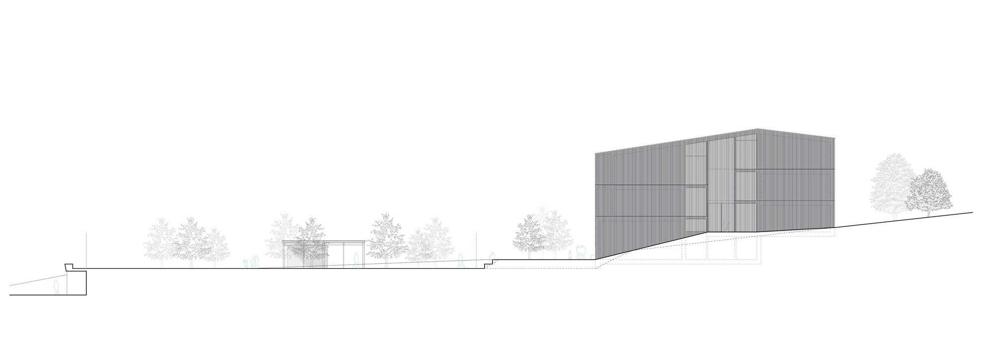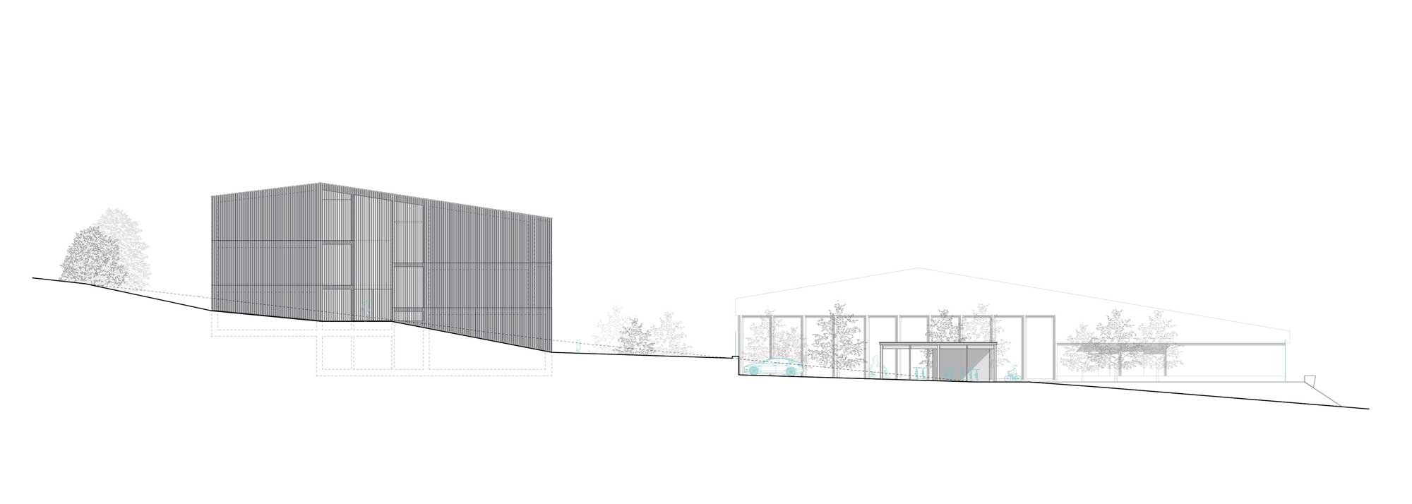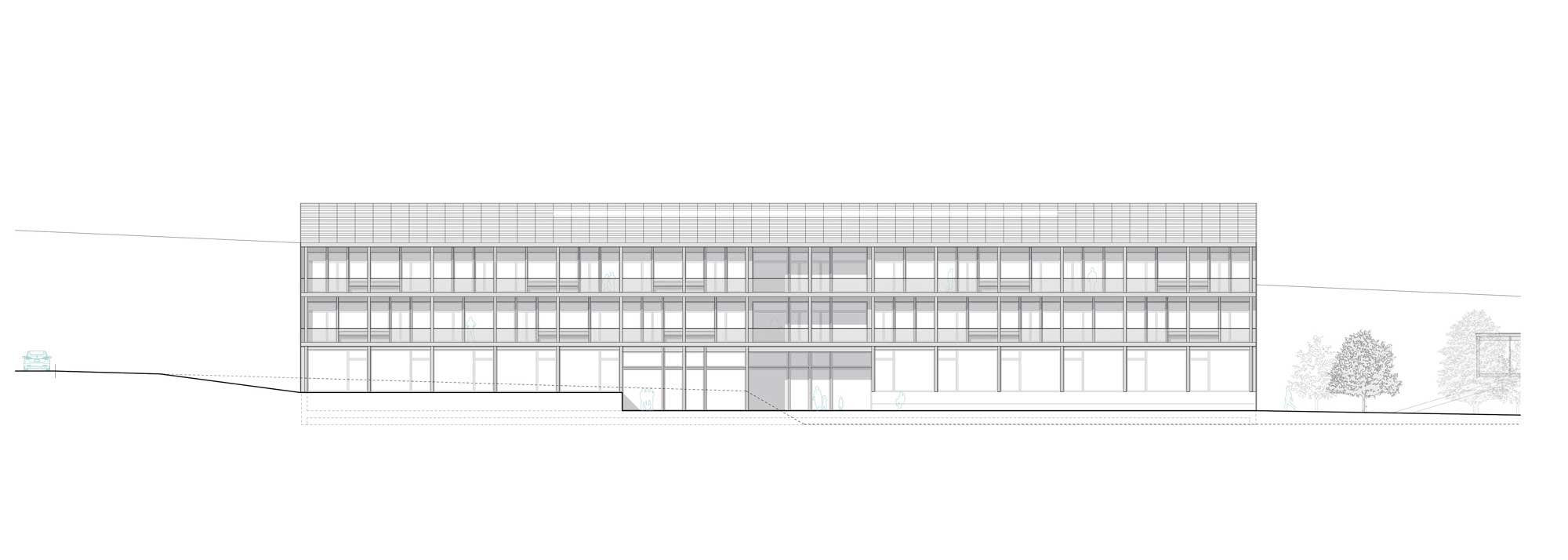 Auf die Hanglage wird mit einem Split Level eingegangen. Im Zusammenhang mit Hangwasser sind keine kostspieligen Untergeschosse vorgesehen. Das Gebäude wird also möglichst subtil auf das bestehende Gelände aufgesetzt, an den natürlichen Terrainverlauf angepasst und an die vorhandene Infrastruktur (Turnhalle und Allwetterplatz) angeschlossen.