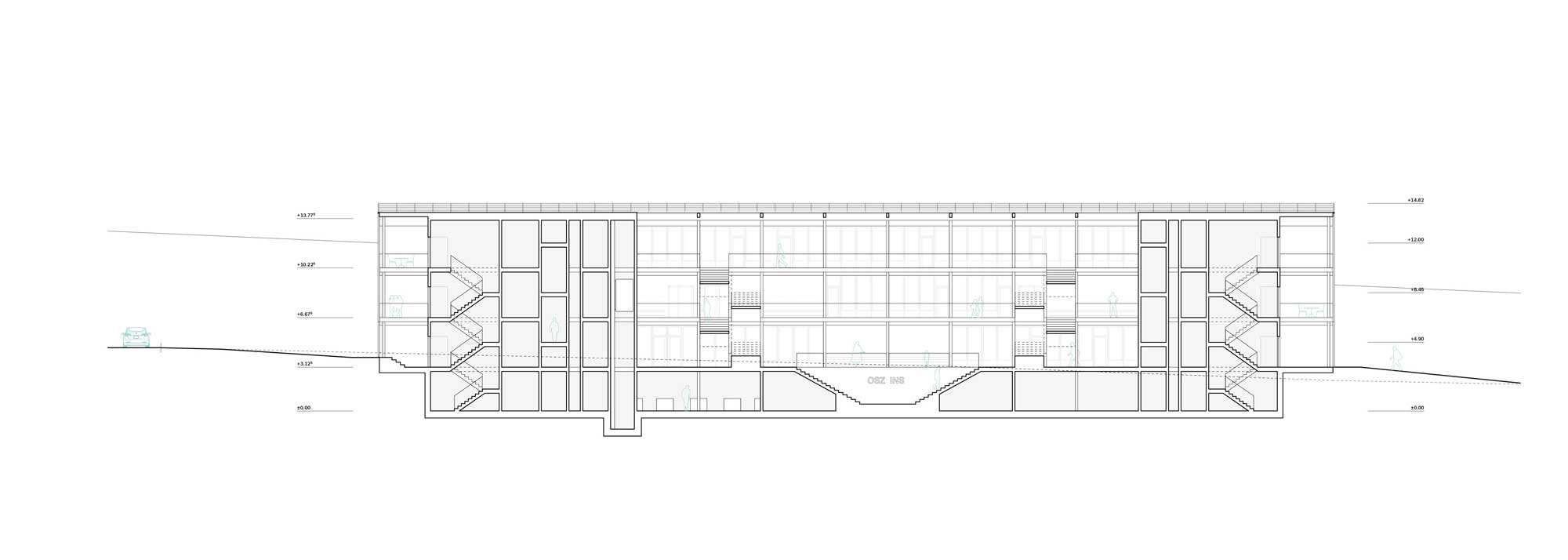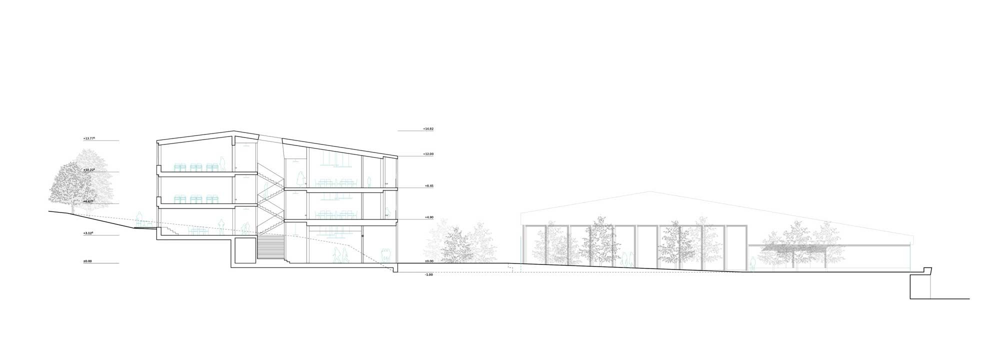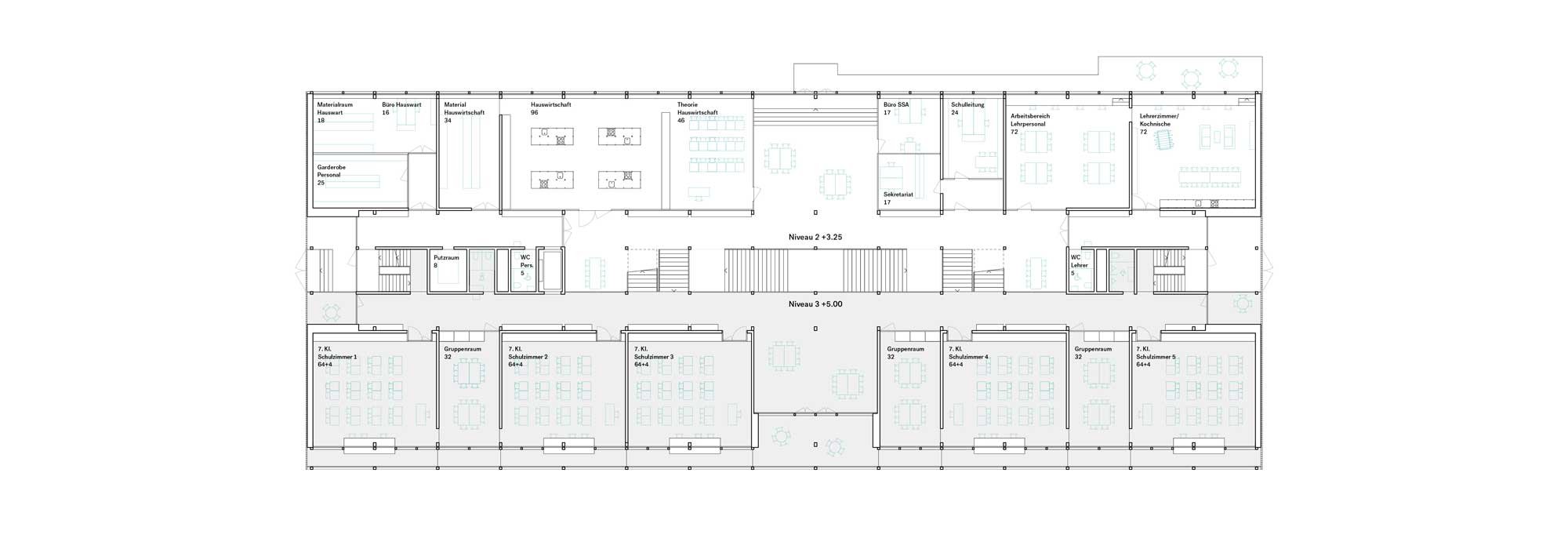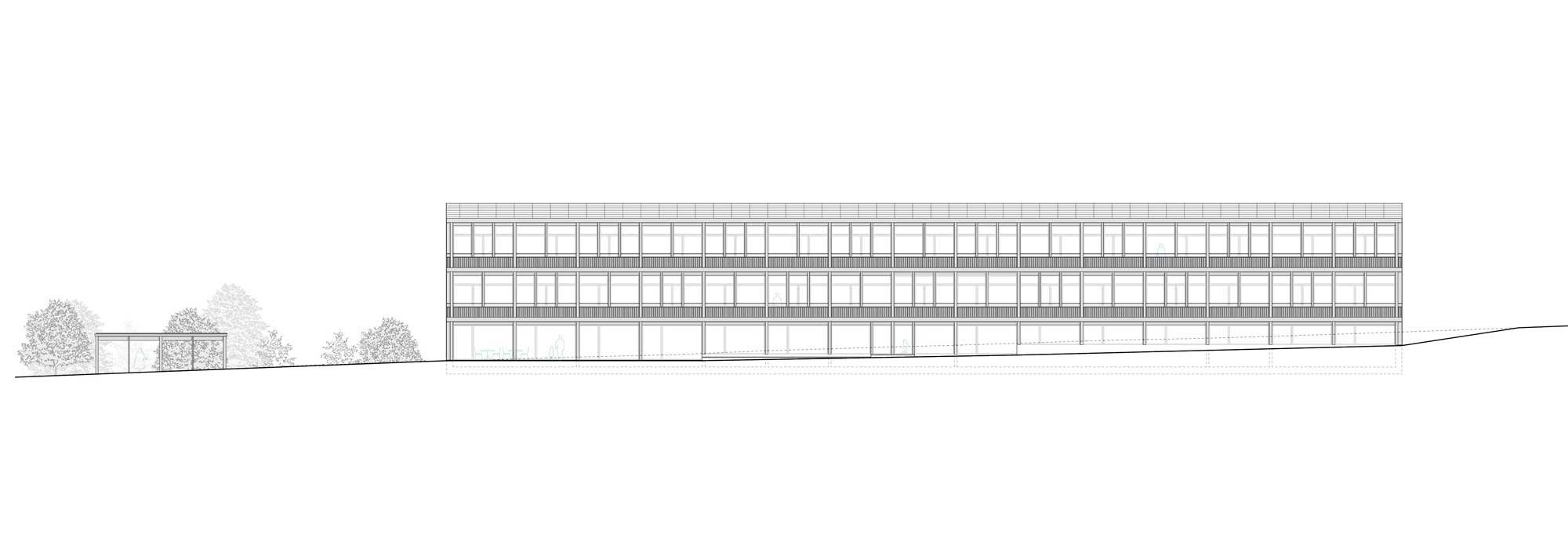 Auf die Hanglage wird mit einem Split Level eingegangen. Im Zusammenhang mit Hangwasser sind keine kostspieligen Untergeschosse vorgesehen. Das Gebäude wird also möglichst subtil auf das bestehende Gelände aufgesetzt, an den natürlichen Terrainverlauf angepasst und an die vorhandene Infrastruktur (Turnhalle und Allwetterplatz) angeschlossen.