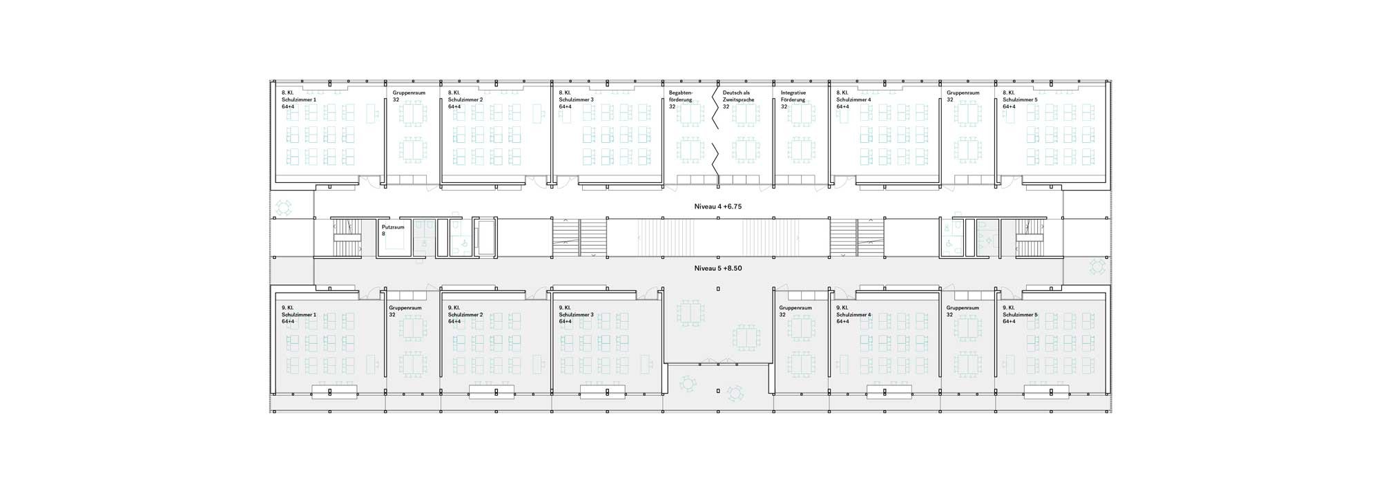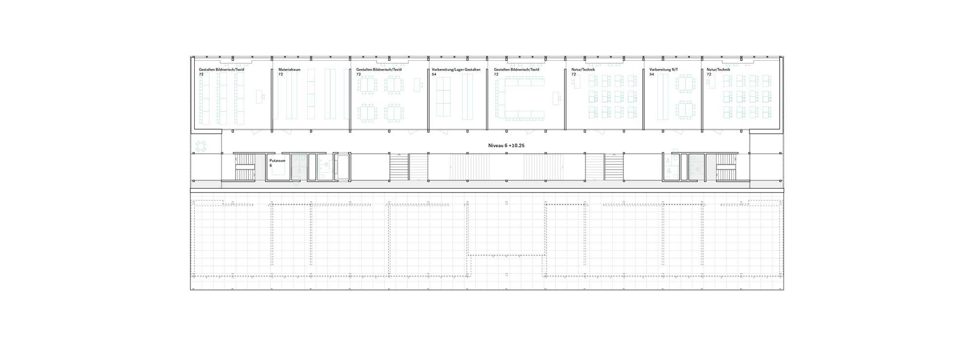 Das statische Raster leitet sich aus den Raumgrössen für die Klassenzimmer und die Gruppenräume ab. Die nichtragenden Zimmertrennwände können einfach demontiert oder verschoben werden und ermöglichen eine maximale Grundriss und Nutzungsflexibilität.