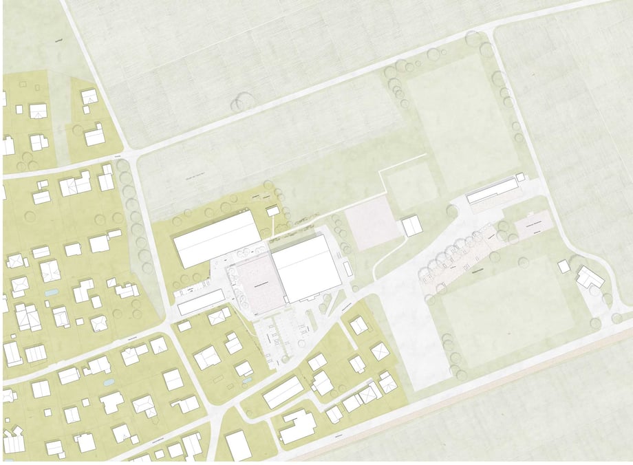 Formal ist der Neubau an den bäuerlichen Kontext von Ins angepasst und auf den bestehenden Bau der Turnhalle abgestimmt. Es entsteht ein Campus der in seiner Art an eine traditionelle Weiler-Baugruppe erinnert und die Entwicklung des Vielfingerdorfes selbstverständlich fortschreibt.
