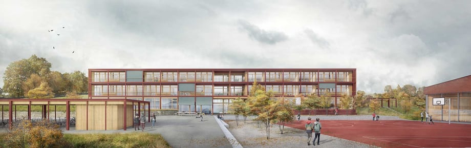 Alle Hauptnutzflächen der Schule werden in einem einzigen kompakten Neubau untergebracht, der auf der nördlichen Seite des Allwetterplatzes in die orthogonale Struktur der bestehenden Anlage eingesetzt wird.