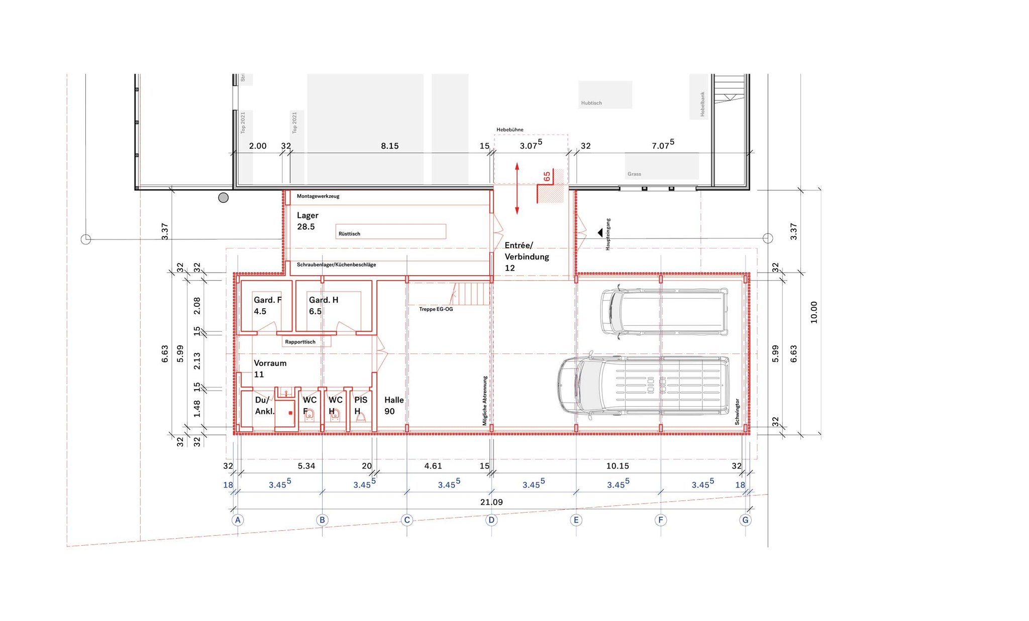 Heute sind die Bedürfnisse der Schreinerei nicht mehr kompatibel mit der bestehenden Halle. Ein neues Volumen soll nun Raum für Personal-, Lager- und Einstellräume für Fahrzeuge bieten.