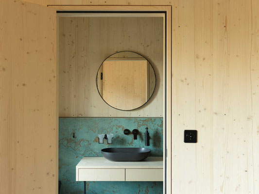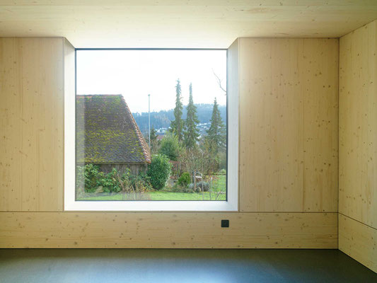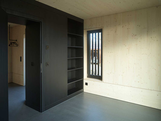 Die Raumatmosphäre wird geprägt durch das warme Fichtenholz an Wänden und Decken. Kontraste werden mit schwarzen Einbauten gesetzt sowie dem dunklen Anhydritboden.