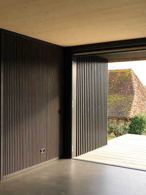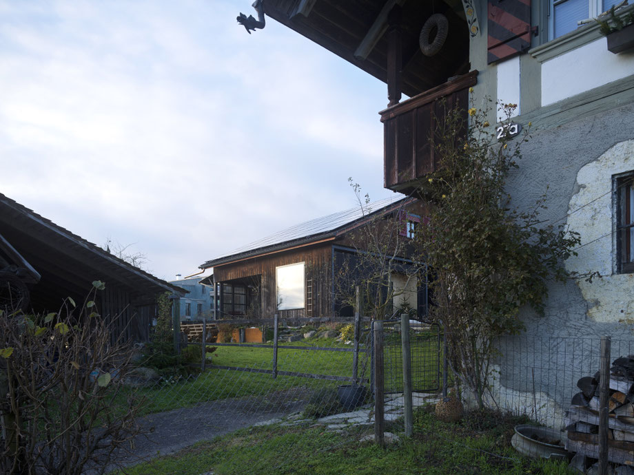 Durch die Setzung des neuen Autounterstands entsteht mit dem Schopf und dem bestehenden Stöckli eine Hofsituation, welche zum neuen Zentrum der Gebäudegruppe wird. Zudem wird ein zweiter gefasster Aussenraum durch die neue Veranda im Süden des Schopfes mit dem historischen Stöckli und dem Speicher aktiviert und schafft hohe Aufenthaltsqualität.