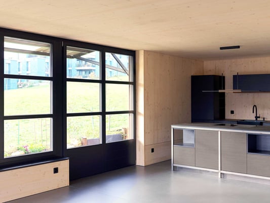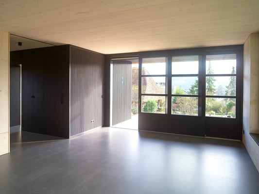 Durch die grosszügige Höhe der Einstellhalle konnten die Wohnräume in Holzständerbauweise einfach eingefügt werden. Die schwarzen Volumen schaffen einen klaren Kontrast zum Bestand und verhalten sich gleichzeitig ruhig und zurückhaltend.
